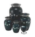 - UNIQUE DESIGN. Made of brass in a blue finish, featuring pewter paw prints encircling the urn.